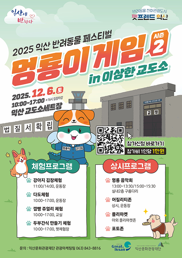 재단법인 익산문화관광재단이 오는 6일 익산교도소세트장에서 반려동물과 함께하는 체험형 행사 ‘2025 익산 반려동물 페스티벌-멍룡이 게임 시즌2’를 개최한다. 이번 행사는 익산시 반려동물 친화관광도시 조성 사업의 일환으로, 지난해에 이어 세트장의 이색적인 공간 특성을 살린 참여형 프로그램들로 꾸려진다.