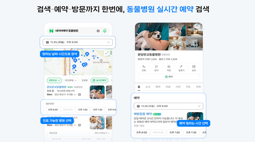 네이버 플레이스 사업기획 이세훈 리더는 “실시간 예약 필터를 도입해 반려동물을 키우는 사용자가 원하는 시간에 동물병원을 방문할 수 있도록 검색부터 예약까지 이어지는 과정의 편의와 효율을 높이고자 했다”며, “앞으로도 사용자의 온·오프라인 장소 경험을 최적화하기 위해 플레이스 기능들을 고도화해 나가겠다”고 밝혔다.